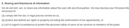 )، لكن إذا قمت بقراءتها جيداً ستلاحظ أن الشركة تقول أنها لا تبيع أو تشارك معلوماتك مع أي جهة، إلا أنها قد تكشف عن معلوماتك إذا كان ذلك “ضرورياً” للحالات التالية: