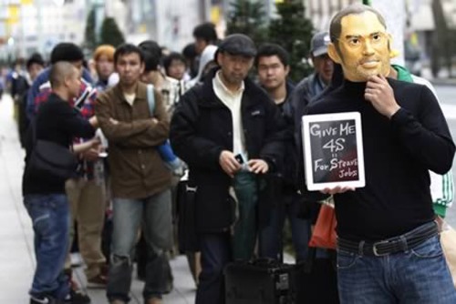 3) عندما صدر هاتف “الآيفون 4” شهدت الكثير من متاجر “آبل” ازدحاماً كبيراً، هذه الصورة التقطت لأحدهم وهو يرتدي قناع يحمل ملامح رئيس شركة “آبل” الراحل “ستيف غوبز”.