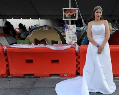 4) إحدى السيدات بفستان زفاف قبل أن تحجز تذكرة سينما لمشاهدة أحد أجزاء سلسلة لأفلام Twilight التي دائماً ما تزدحم دور السينما عند عرضه.