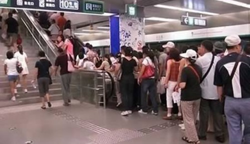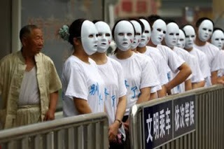 5) نظراً لأنه بلد ذو نسبة سكانية عالية، تنتشر في الصين ظاهرة الطوابير في كل مكان، وفي بعض الأحيان يتدافع الناس بشدة الأمر الذي يكون مزعجاً للكثيرين، لهذا قامت بعض الفتيات بالوقوف في أحد الصفوف وهن واضعين قناع أبيض غريب الشكل على وجوههن ومرتديين “تي شيرت” أبيض مكتوب عليه “قفوا عن التدافع”.
